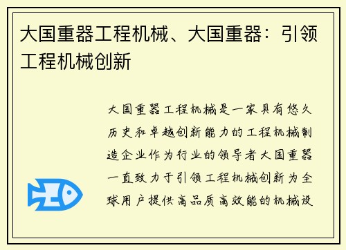 大国重器工程机械是一家具有悠久历史和卓越创新能力的工程机械制造企业。作为行业的领导者,大国重器一直致力于引领工程机械创新,为全球用户提供高品质、高效能的机械设备。本文将详细阐述大国重器工程机械的创新之处,以及其在工程机械领域的重要地位。